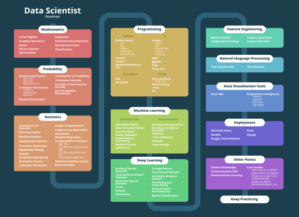 - Machine Learning: Study algorithms and techniques, and get hands-on experience with libraries like scikit-learn, TensorFlow, and Keras.