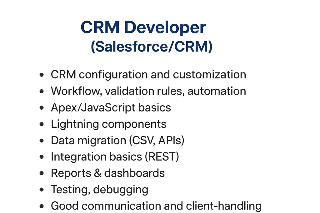 Step 1: Master CRM basics – understand CRM concepts, modules (Sales, Service, Marketing), and customer lifecycle.