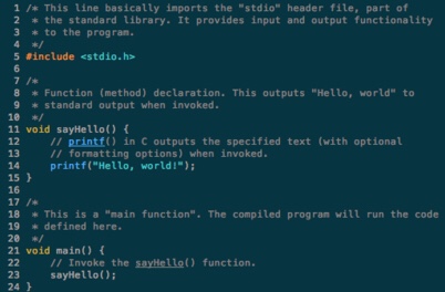 The description of a programming language is usually split into the two components of syntax (form) and semantics (meaning). Some languages are defined by a specification document (for example, the C programming language is specified by an ISO Standard) while other languages (such as Perl) have a dominant implementation that is treated as a reference. Some languages have both, with the basic language defined by a standard and extensions taken from the dominant implementation being common.